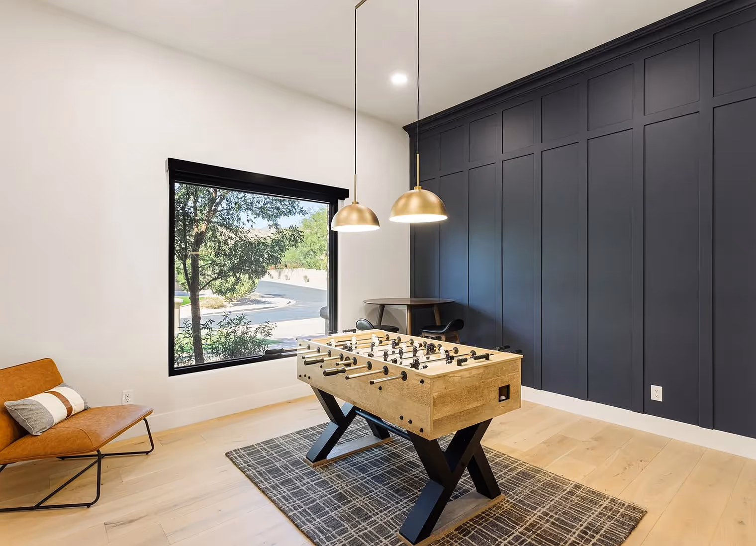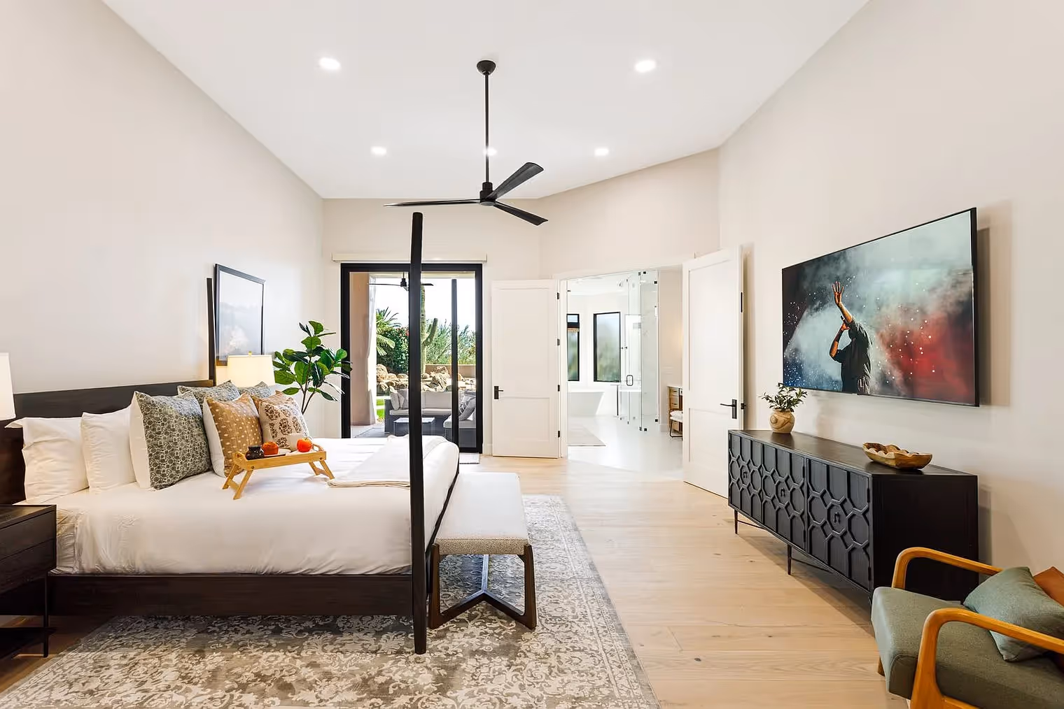 Simplified fireplaces, updated lighting, and wider doors now connect the interior with the backyard and pool.