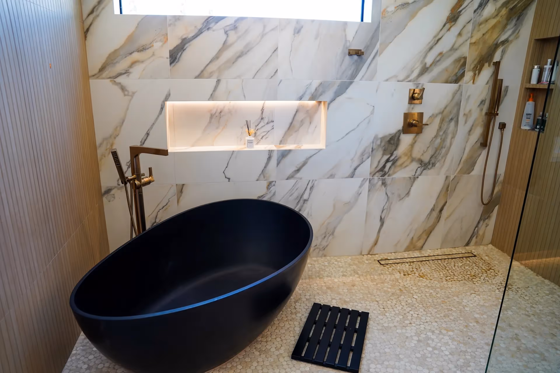 Dramatic veined stone, sculptural fixtures, and soft ambient lighting set the tone for the elevated new interior.