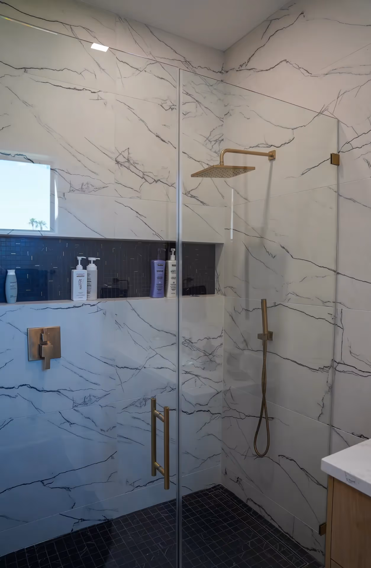 The master suite was expanded and redesigned with warm modern finishes, including a spa-like bathroom and a hidden-door office tucked seamlessly into the layout.