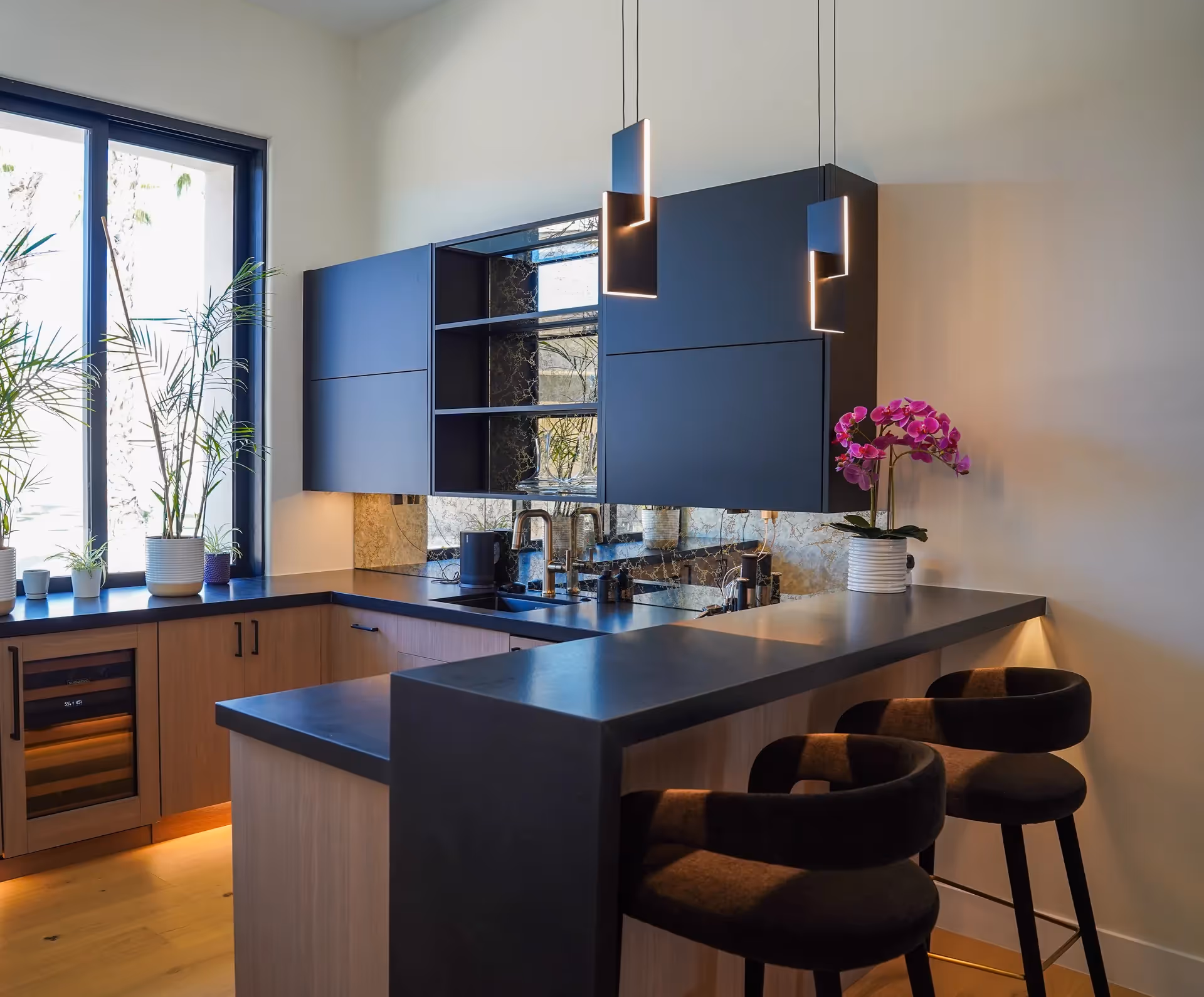 The home was extended further to create a luxury bar space with accordion windows that open directly to the pool, blending indoor comfort with outdoor living.